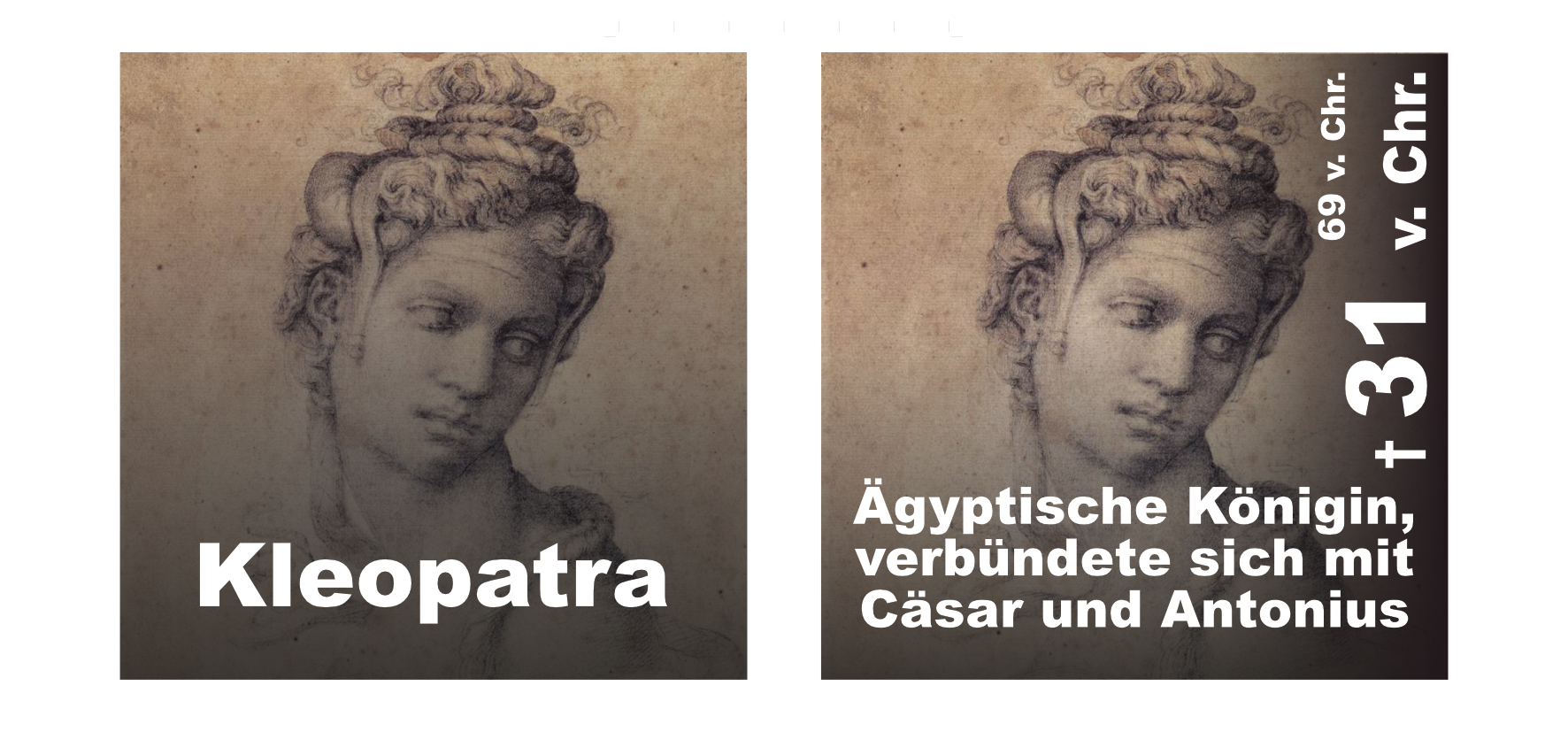 Mozart, Haydn, Rembrandt, Kolumbus, Bach, Beethoven, Leonardo da Vinci, Michelangelo, Julius Caesar, Goethe, Dürer, Lessing, Napoleon, Einstein, Shakespeare, Darwin, Karl der Große, Ludwig XIV., Luther, Kant, Marie Curie, Kleopatra, Virginia Woolf, Elisabeth I.(von England)